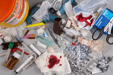 - Sharps waste: Needles, glass slides and cover slips, scalpels, and IV tubing that has the needle attached.