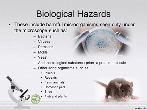 Also known as bio hazards, refer to biological substances that pose a threat to the health of living organisms, primarily that of humans. This can include medical waste or samples of a microorganism, virus or toxin (from a biological source) that can affect human health. It can also include substances harmful to other animals.